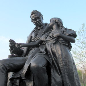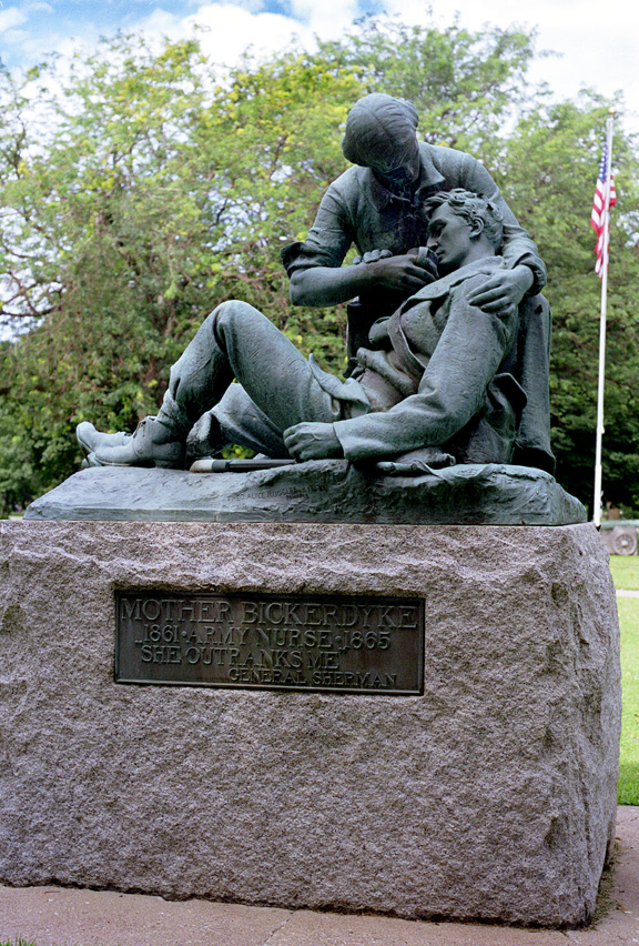 Cosa: una statua di pietra di “Mother Bickerdyke” che dà da bere a un soldato ferito con un’iscrizione alla base che dice “She outranks me’—General Sherman.”