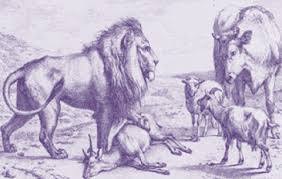 Non c’è mai da fidarsi dell’alleanza con un potente. La vacca, la capretta e la pecora fecero società con il leone. Ma catturato un cervo dal vasto corpo, così parlò il leone, fatte le parti: “Io mi prendo la prima perché mi chiamo leone; la seconda, come socio, me la assegnerete; poi, dato che sono il più forte mi toccherà la terza; guai a chi mi toccherà la quarta”. Così lui solo, con malvagia impudenza, si portò via tutta la preda.