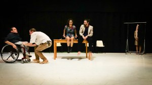 Uno spazio scenico essenziale. Una sedia, un tavolo, alcuni abiti chiari appesi ad un bastone sono gli elementi che definiscono uno spazio.