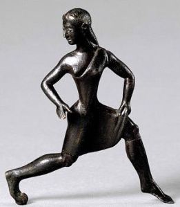 Nelle Olimpiadi Moderne la partecipazione delle donne è stata una conquista lunga e graduale, e forse tutt’ora le atlete non sono considerate alla stessa stregua dei loro colleghi maschi. Ma nelle Antiche Olimpiadi, che si svolsero ad Olimpia ogni quattro anni, dal 776 aC. al 393 dC., la partecipazione femminile non era proprio contemplata, nemmeno come pubblico: se una donna sposata fosse stata sorpresa ad assistere ai Giochi sarebbe stata gettata, dalla sommità del Monte Typaeum, nel fiume che scorreva alle sue pendici, almeno secondo il racconto di Pausania, storico e geografo greco vissuto nel II secolo dC.