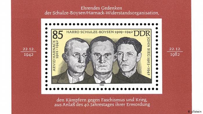 | Francobollo commemorativo dei tre “vertici” della Rote Kapelle Harro Schulze-Boysen, Arvid Harnack e John Sieg |