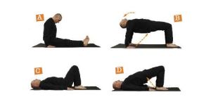 Seduti/e, gambe distese e piedi larghi quanto le anche; tronco eretto, mento che tocca lo sterno e palme appoggiate a terra con le dita in avanti (A), piegare le ginocchia, sollevare il bacino e rovesciare indietro la testa, inspirando si sale (B) ed espirando si torna alla posizione di partenza. Versione alternativa e facilitata. Distesi/e, braccia lungo i fianchi e palme a terra, ginocchia ripiegate con i talloni vicini ai glutei (C), sollevare il bacino, inspirando (B). Si ritorna alla posizione di partenza espirando. |