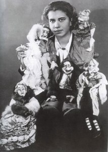 Artista tra le più rappresentative del Teatro di Figura del ‘900, Maria Signorelli, nata a Roma il 17 novembre del 1908, raccolse fin dall’infanzia le molte suggestioni che le vennero dall’ambiente familiare e dal “salotto” che suo padre, Angelo, e la madre, Giga Resnevic, appassionata di teatro e biografa della Duse, tennero per anni nella loro casa. Dopo il liceo si iscrìve all’Accademia di Belle Arti di Roma al corso di scenografia del Teatro Reale, diretto da Nicola Benois.