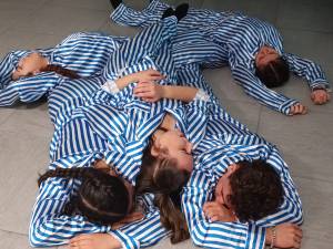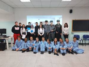 Hanno scelto un gruppo di allieve e allievi a cui hanno affidato vari ruoli, c’era il gruppo dei/lle narratori/e che leggevano frasi di autori e autrici celebri contro qualunque genocidio e per la pace, c’era il gruppo che ha interpretato i/le reclusi/e nei lager, tre di loro impersonavano degli ufficiali nazisti e due dei/lle narratori/rici hanno anche cantato celebri canzoni concludendo con “Imagine”.