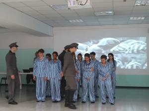 Hanno scelto un gruppo di allieve e allievi a cui hanno affidato vari ruoli, c’era il gruppo dei/lle narratori/e che leggevano frasi di autori e autrici celebri contro qualunque genocidio e per la pace, c’era il gruppo che ha interpretato i/le reclusi/e nei lager, tre di loro impersonavano degli ufficiali nazisti e due dei/lle narratori/rici hanno anche cantato celebri canzoni concludendo con “Imagine”.