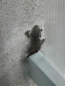 È uno splendido geco che ha scelto di stare in un angolo su muro del mio piccolo balcone, immobile, forse si sente protetto dalla ringhiera e della lastra di plastica che abbiamo messo contro il vento e la pioggia invernale.