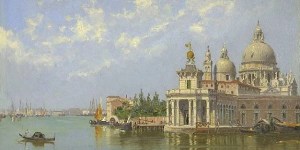 Venezia resta sicuramente la protagonista indiscussa dei suoi dipinti: Piazza San Marco, il Canal Grande, il Ponte di Rialto, il Ponte dei Sospiri, Palazzo Ducale, le vedute più note, ma anche la Venezia poco conosciuta, delle calli strette, dei piccoli canali, dove la gente semplice è impegnata in faccende quotidiane, scene sempre ritratte con una precisione fotografica, e un’attenzione particolare al variare della luce nelle diverse ore del giorno e nelle diverse condizioni meteorologiche. È la raffinatezza, la delicatezza con cui rende lo studio della realtà, la sua cifra stilistica, che riesce a trasformare il vero in una immagine poetica. Sono la luminosità intensa, l’aria tersa, i colori che predilige, quelli che meglio catturano la luce, l’azzurro dei cieli di Venezia, lo scintillio delle acque, il chiarore delle pietre degli edifici, il rosa e il grigio delle nuvole al tramonto.