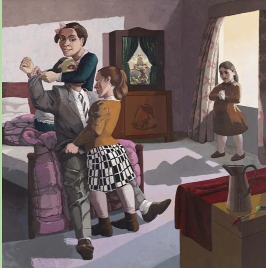Stesso sguardo femminile anche quando l’artista ritrae la Famiglia, dove si assiste a un rovesciamento dei rapporti di potere: una figura maschile è passiva e inerte nelle mani di due donne che apparentemente si apprestano a spogliarlo.