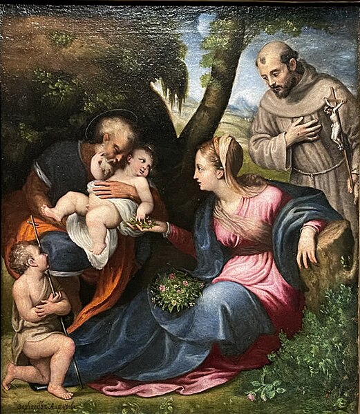 Anche Sofonisba Anguissola (1532-1625) nelle sue rappresentazioni sacre ha raffigurato i soggetti religiosi con uno stile intimo. La sua Sacra Famiglia con Giovanni Battista e Francesco, datata 1559, raffigura una scena bucolica: al centro c’è la figura della Vergine seduta, indossa un mantello fluente rosso e azzurro, e osserva amorevolmente il Bambino tra le braccia di Giuseppe offrendogli erbe e fiori mentre il piccolo Gesù gioca con la morbida barba del padre. Un giovane Giovanni Battista è in primo piano, dietro al gruppo S. Francesco. Il dipinto esprime una delicata tenerezza soprattutto nel rapporto tra madre e figlio.