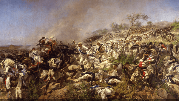 Valga per tutti l’esempio di Michele Cammarano, artista napoletano, che ottiene, nel 1888, una commissione ministeriale per una grande tela commemorativa della Battaglia di Dogali. Cammarano, fedele ai principi di oggettività e osservazione dal vero, si reca di persona nei luoghi della battaglia. Ne scaturisce un’opera celebrativa dell’esercito italiano nel contrasto tra bianco/nero, vestito/seminudo. Il gruppo candido delle divise dei soldati italiani è schiacciato sui due lati da masse nere di africani e all’apice dello scontro, al centro dell’opera, l’ufficiale italiano blocca con la sinistra la lancia di un nemico, minacciandolo con la sciabola. Alla sua destra un guerriero africano, coperto da una pelle di leopardo e accovacciato per prendere la mira, simboleggia il nemico selvaggio ma temibile, che come una fiera si prepara all’attacco.