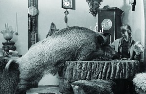 È molto eloquente e anche divertente una fotografia in cui sul divano della casa in mezzo alla foresta stanno un cane e il cinghiale e, sul tappeto, lei, Simona. Seduta a ricamare sta la madre, in un raro momento di tregua, come se niente fosse. Un mondo all’incontrario. Sono molte le fotografie che testimoniano e ci fanno conoscere il rapporto speciale fra Simona e gli altri animali. Il destino volle che compagno di vita della Kossak fosse Lech Wilczek, un fotografo naturalista.